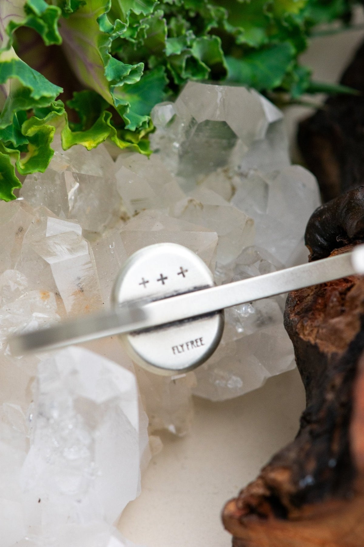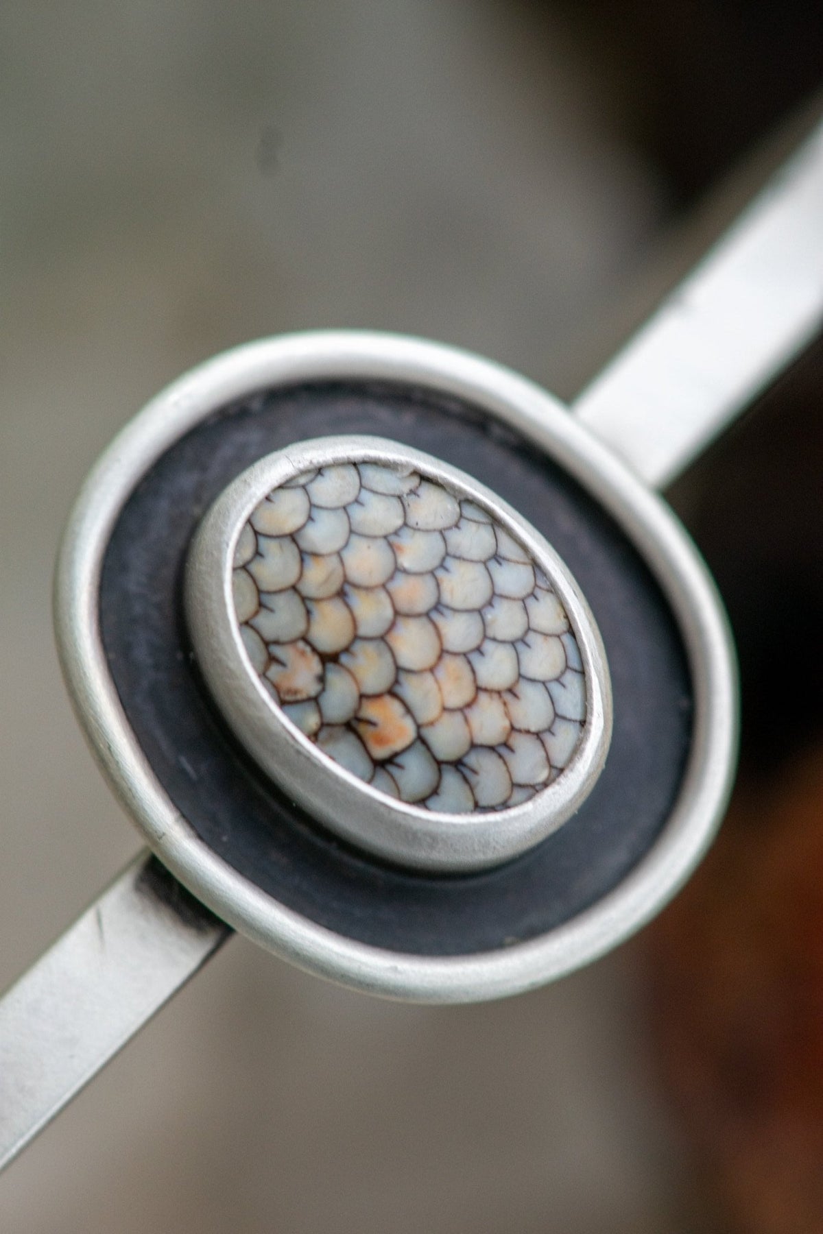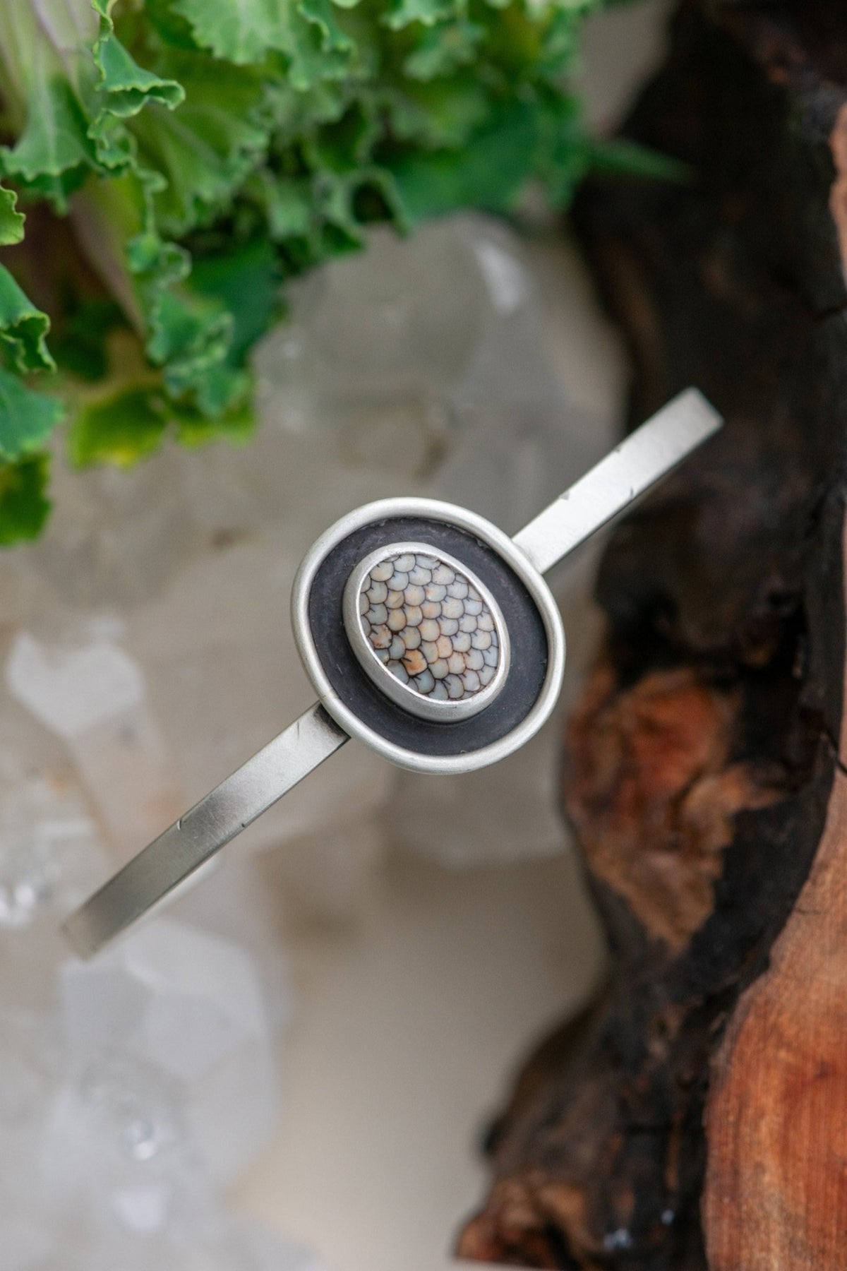 This cuff is a medium one size fits all. These cuffs can be gently adjusted once on. A slow pressure to the sides and from the top and bottom.