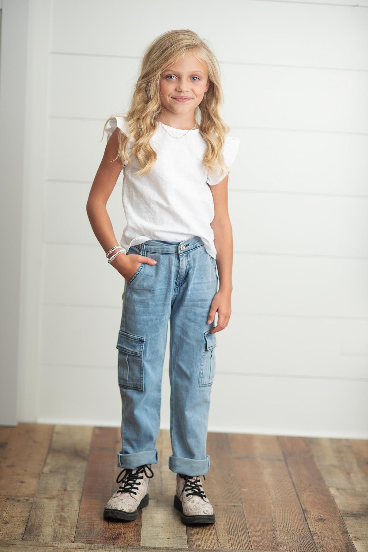 Adorable light wash denim cargo pants Jeans.  Button and zipper front.  Cutest basic all year long!